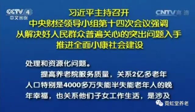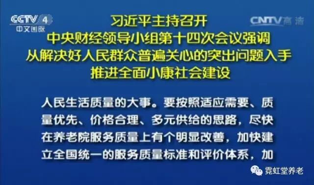 12月21日,中共中央总书记、国家主席、中央军委主席、中央财经领导小组组长习近平主持召开中央财经领导小组第十四次会议。会议听取了民政部关于提高养老院服务质量的汇报。习近平强调,提高养老院服务质量,关系2亿多老年人口特别是4000多万失能半失能老年人的晚年幸福,也关系他们子女工作生活,是涉及人民生活质量的大事。要按照适应需要、质量优先、价格合理、多元供给的思路,尽快在养老院服务质量上有个明显改善,加快建立全国统一的服务质量标准和评价体系,加强养老机构服务质量监管,坚决依法依规从严惩处欺老、虐老行为。